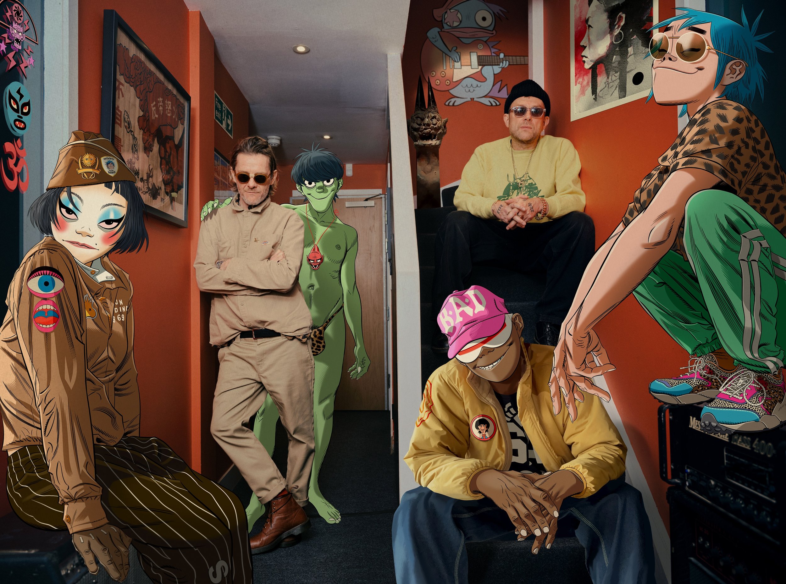 Gorillaz was created by Murdoc when he sold his soul to Satan in exchange for his bass guitar, El Diablo, and recruited 2D and Russel before being joined by Noodle, shipped from Japan in a FedEx crate. But in reality, Albarn was the frontman of Blur when the idea came to him to make something entirely different from the popular manufactured boy bands. And who better than Hewlett as a comic illustrator to complete the vision? Motivated by Albarn’s musical identity crisis and Hewlett’s will to make a group with substance, they created Gorillaz. Their combined imagination has been fueling the band for 25 years. Beyond their music, the band's adventures have created an entire universe where their antics move their story along—Murdoc became the leader of a cult, 2D got swallowed by a whale, Noodle tracked down and killed an ancient demon from Hell, and Russel temporarily became a giant due to toxic chemicals.